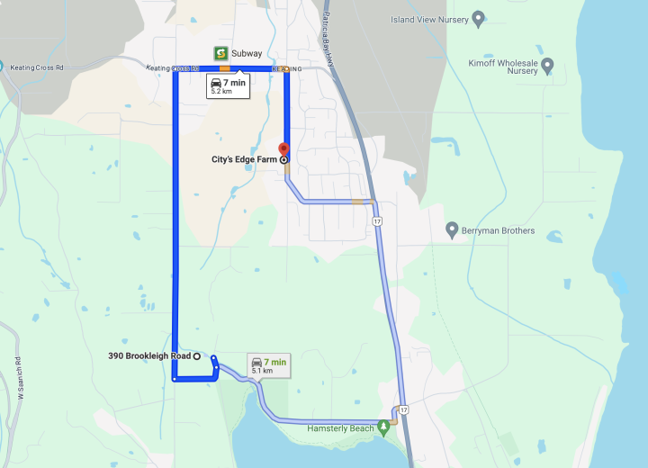 The drive north from The Plot on Brookleigh Rd to City’s Edge Farm on Central Saanich Rd takes 7 minutes. You can either take Oldfield Rd on the western route or Patricia Bay Highway on the eastern route to arrive at City’s Edge. When you arrive at City’s Edge, you will see two driveways – enter the driveway with the turquoise farm sign (not the narrow residential driveway).