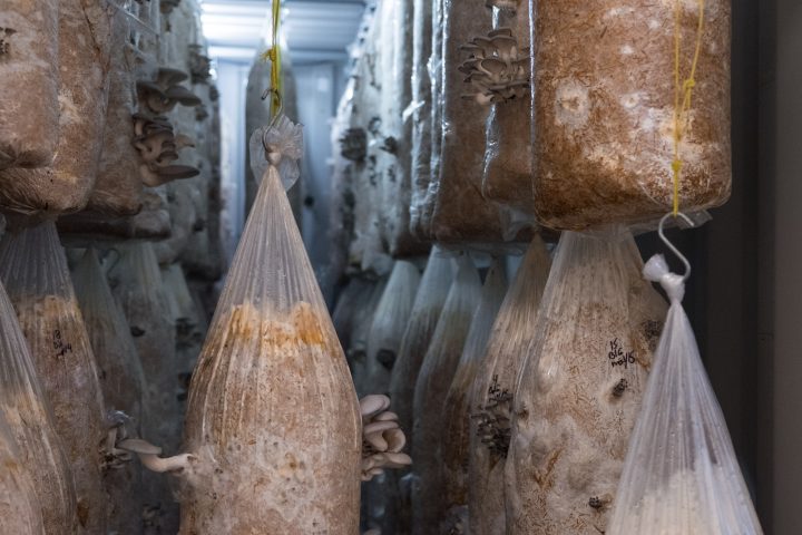 This mix is then spat out into long plastic tubes that resemble giant sausage rolls. The wheat straw is very fibrous, adding a bit of airflow to the mix. These sausage tubes are hung vertically in shipping containers that are monitored by an AI system. 28 days later, they have specialty mushrooms that are ready for market!