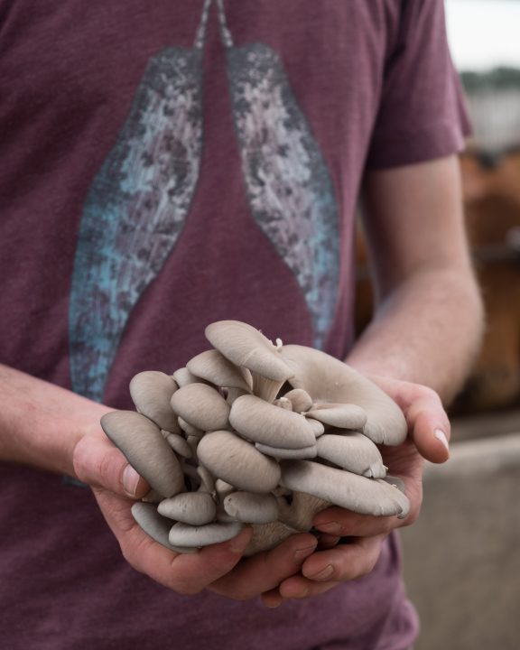 Photo: Alex holds blue oyster mushrooms that were grown on the farm.