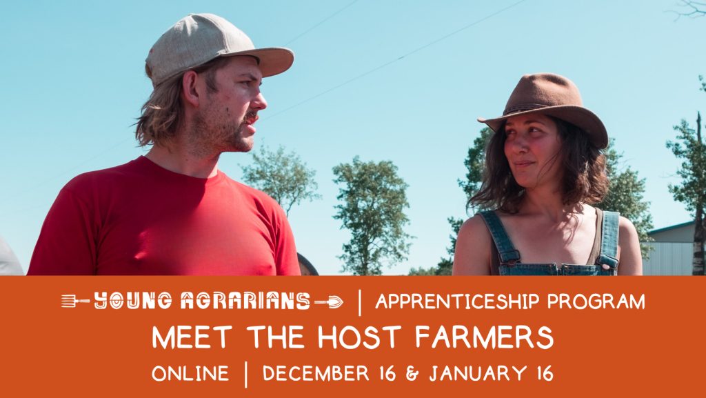 Join us for a webinar (or two) to learn about the Young Agrarians Apprenticeship Program. Meet some of the amazing host farm mentors, ask questions about their farm, learn more about the kinds of apprenticeships they offer, and what a typical day/week is like for their apprentices. Bring your questions! We will be offering this