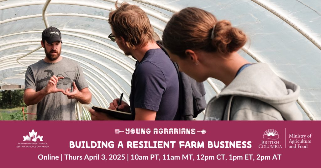 Do you want to build a resilient farm business? Are you looking for tools to support your farm’s risk management strategy? Building a resilient farm business means having the right strategies and tools to manage risk and adapt to changing conditions. Join us for an engaging webinar featuring Heather Watson of Farm Management Canada, Stephanie