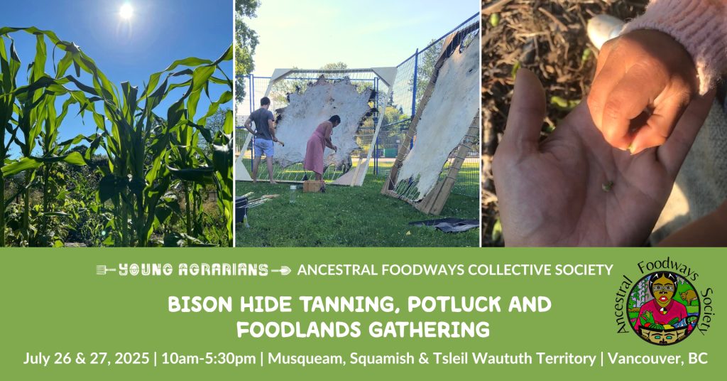 Want to be a part of working towards Indigenous food sovereignty in your community and gain bison hide tanning skills? Join the Ancestral Foodways Collective Society and Young Agrarians at Strathcona Park to participate in tanning bison hides, share a potluck meal that will nourish your spirit and body, and help tend to the foodlands,