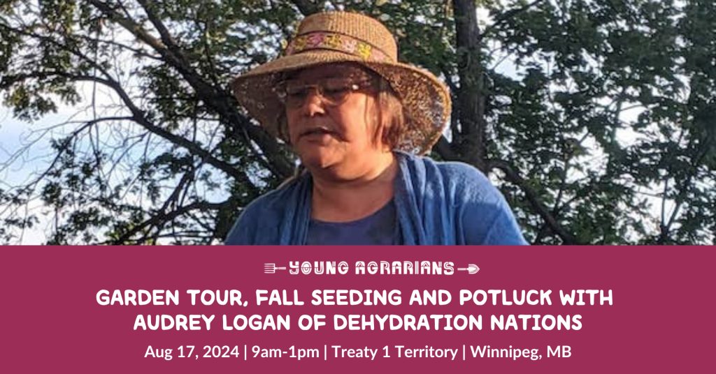 You’re invited to a garden tour, fall seeding and potluck in Winnipeg, Manitoba! Come for the tour, stay for new community connections and share a potluck meal with Audrey Logan of Dehydration Nations. Join us for a morning of tending the land and helping with fall seed sowing while learning from Audrey’s gardening wisdom on