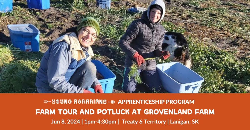 You’re invited to a farm tour and potluck at Grovenland Farm in Lanigan, Saskatchewan! Grovenland is a host farm in the Young Agrarians Apprenticeship Program specializing in pastured livestock and seasonal vegetables. Three generations farm together using Holistic Management practices. Come check out this diverse family farm and celebrate the start of the summer season!