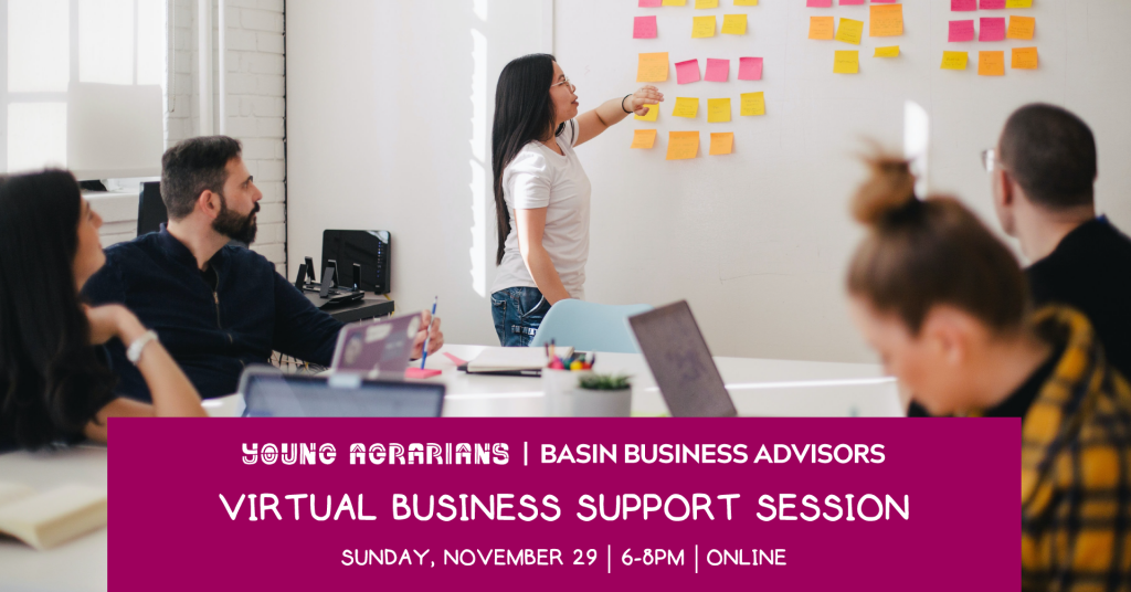 You’re invited to a virtual business support and brainstorming session presented by Young Agrarians and Basin Business Advisors. This is the ninth event of the Young Agrarians 2021 Farm Club event series. What is a Farm Club? A Farm Club is when farmers come together to connect and nerd out with other farmers on farming-related