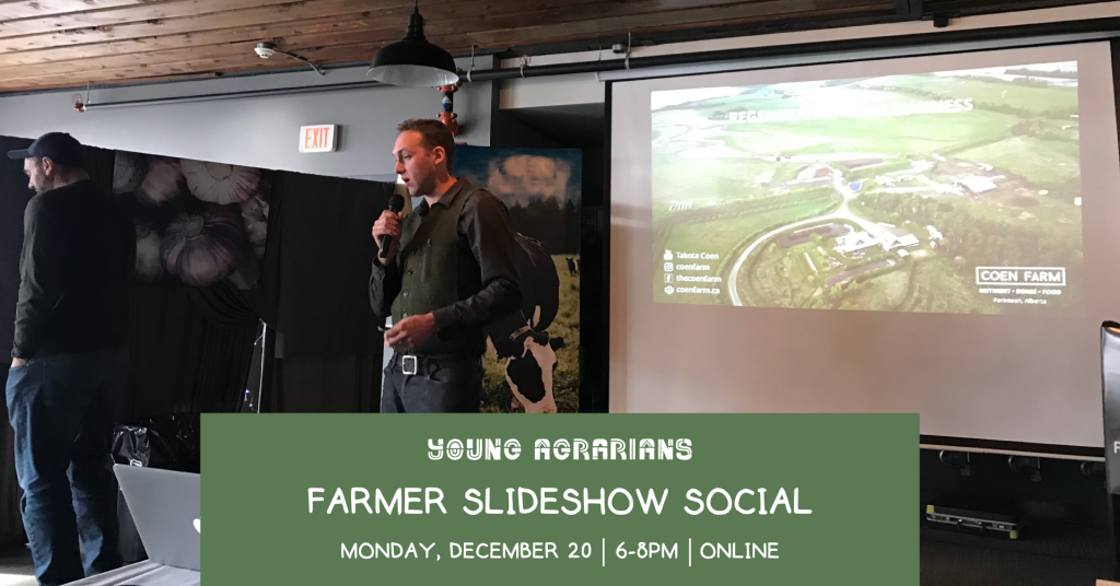 You’re invited to an online Farmer Slideshow Social to celebrate the end of the 2021 farming season and ring in the holidays! This is the tenth and final event of the Young Agrarians 2021 Farm Club event series. What is a Farm Club? A Farm Club is when farmers come together to connect and nerd