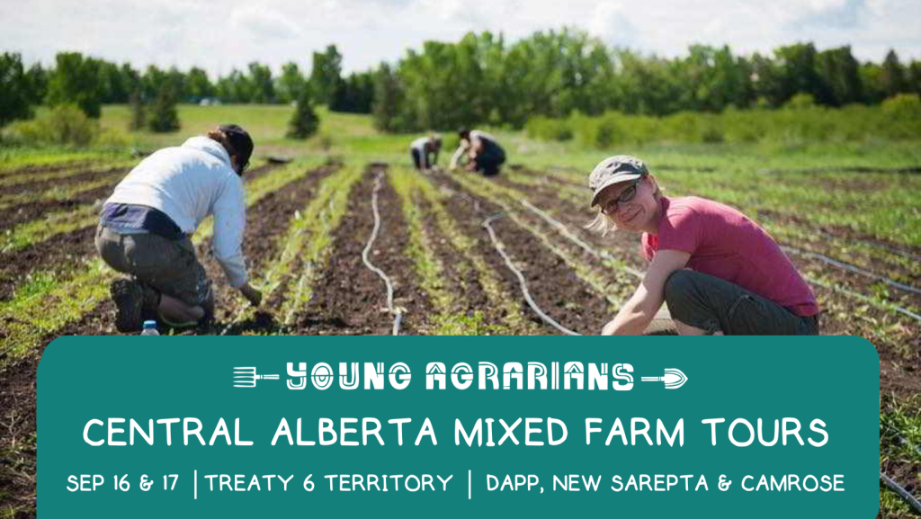 Join Young Agrarians for a two-day farm tour to learn about three unique farms in Central Alberta! Starting near Dapp, AB on Saturday morning, then touring east to New Sarepta in the afternoon, and wrapping up Sunday morning in Camrose. Join for the whole tour or drop in along the way! WHEN: Saturday, September 16