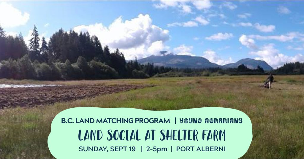 You’re invited to a socially-distanced outdoor Land Social at Shelter Farm in Port Alberni, B.C.! If you’re curious about what land matching and sharing is all about – or just want to check out what your local farmers and farm interns are up to – join us for the event. Shelter Farm hosts Shelter Farm