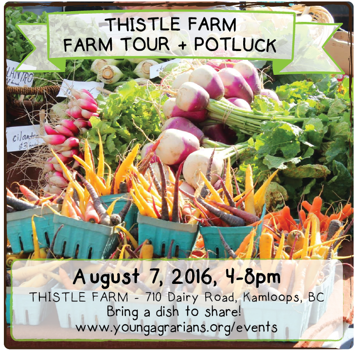 WHEN: August 7, 2016, 4-8PM WHERE: Thistle Farm – 710 Dairy Road, Kamloops, BC Join YA for a tour of Thistle Farm, 7-acre organic vegetable farm in Kamloops. The evening will start with a farm tour by owner/operator Dieter Dudy, followed by a potluck and Q&A session. The tour will stop by the farm shop and wash
