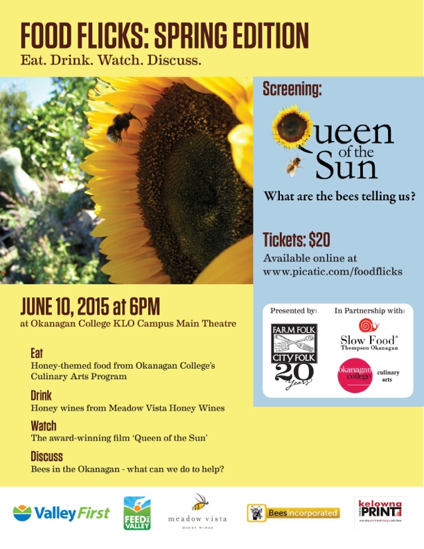 FoodFlicks: Spring Edition is a new event hosted by FarmFolk CityFolk, in partnership with Slow Food Okanagan and Okanagan College’s Culinary Foods Program. On June 10th join us to Celebrate the Bees – with honey-themed nibbles (from Culinary Arts Students), honey wine tastings (with Meadow Vista Honey Wines), a screening of the award-winning film ‘Queen of The