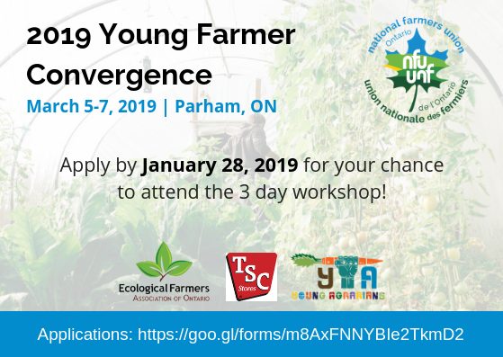 The National Farmers Union (NFU) Youth and in partnership with the Ecological Farmers Association of Ontario is planning for the 2019 Young Farmer Convergence! The purpose for the gathering is to offer young farmers workshops, planning and skill-sharing. Our mission is to build capacity for young farmers to be part of an effective social movement