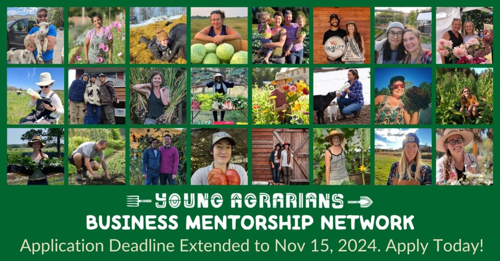 Ready to Grow Your Farm Business? Are you a new farmer, operating a new farm or taking over as the next generation on your family farm? Do you need guidance to grow your business? Do you live in BC, Alberta, Saskatchewan or Manitoba? Apply NOW for the Young Agrarians Business Mentorship Network! APPLICATION DEADLINE OCT