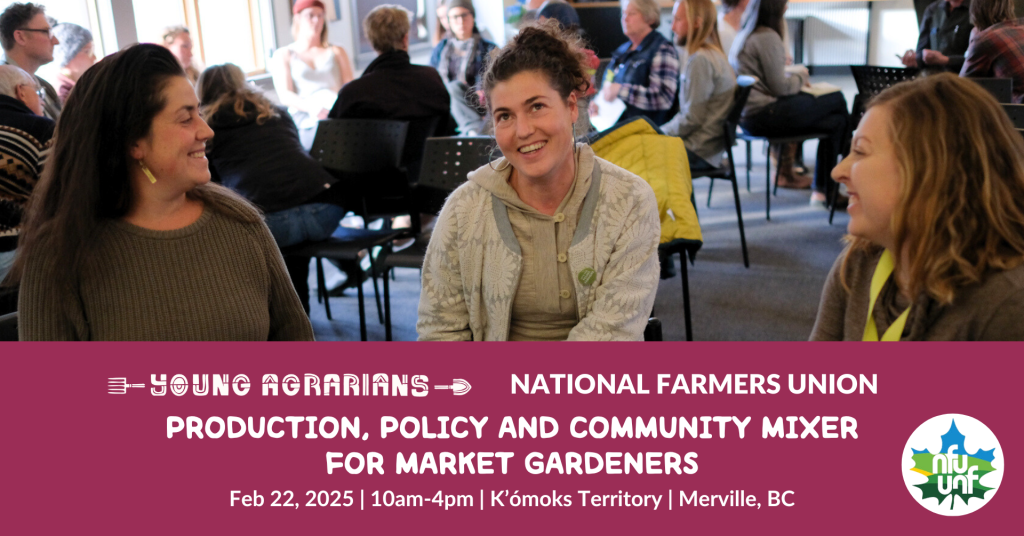Calling all market gardeners! You’re invited to a Production, Policy and Community Mixer on Saturday, February 22 in Merville, BC. This event will be co-hosted by Young Agrarians and the National Farmers Union (NFU), a direct-membership, farmer-led organization that has advocated for food systems rooted in social and economic justice as well as agroecology and