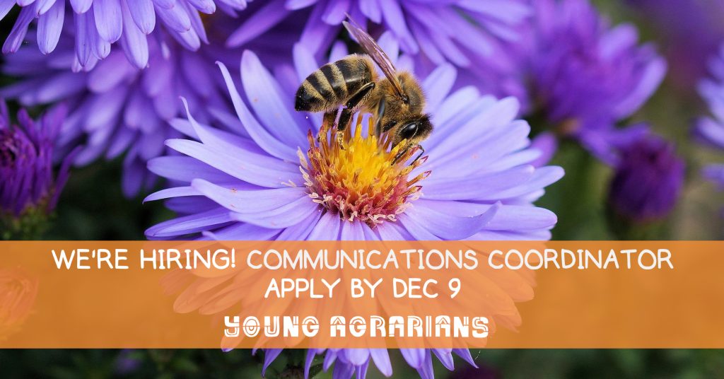 Young Agrarians is hiring a Communications Coordinator! Location: Western Canada Application Extended! 5pm, Friday December 9th, 2022 ABOUT YOUNG AGRARIANS Young Agrarians (YA) is an educational resource network for new and young ecological farmers in Canada. YA recognizes the Indigenous lands and territories that we work on and alongside. YA is committed to providing programs