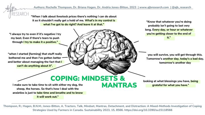 Many farmers discussed all the farming factors that cannot be controlled – the weather, the markets, government regulation and new legislation, machinery breakdown, etc. Because there is little to nothing that can be done to prevent the impacts of these factors, worry and rumination often set in. However, participants also described mindsets they adopted which helped them cope with this stress, like acceptance, looking on the bright side, and gratitude.