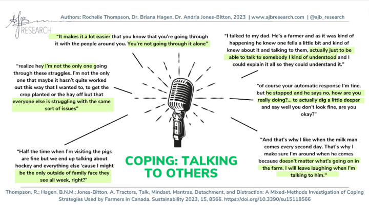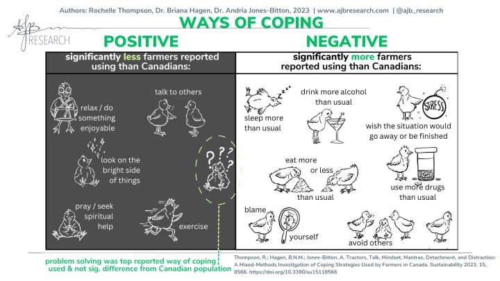 Of course, not all ways of coping that farmers described were positive or healthy. Alcohol use, smoking, and self-isolation were also discussed. In the 2021 Survey of Farmer Mental Health in Canada, fewer farmers used positive coping strategies and more farmers used negative coping strategies compared to the Canadian public.