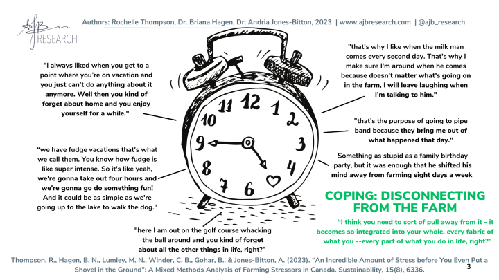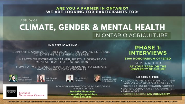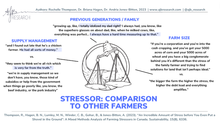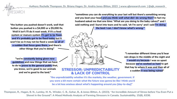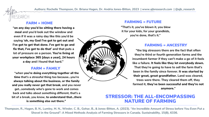 The results from this research will be useful to inform stress-reduction avenues for farmers. Additional findings and resources from this work can be found at www.ajbresearch.com, or on Instagram or Twitter at @ajb_research. This research also led to a study we are currently conducting, investigating Ontario farmers’ ways of coping through crises, like crop and livestock loss due to extreme weather, disease, and pests. If you or someone you know is interested in participating or would like to know more, please contact rthomp10@uoguelph.ca.