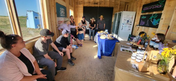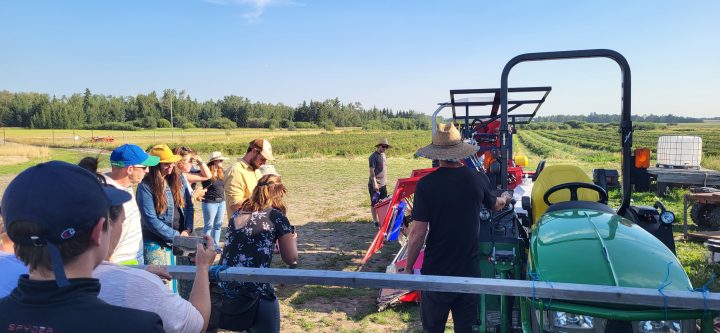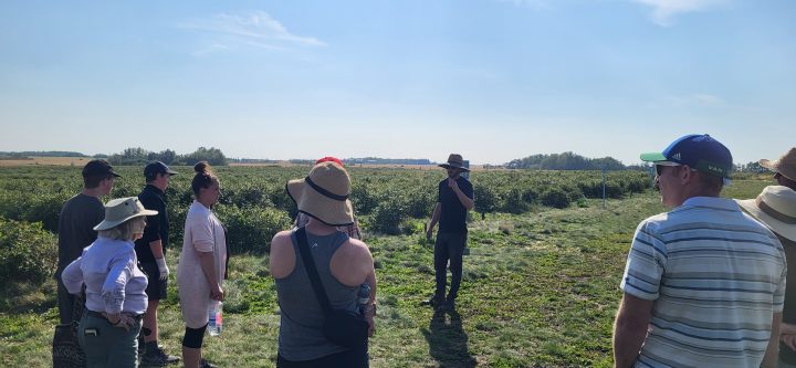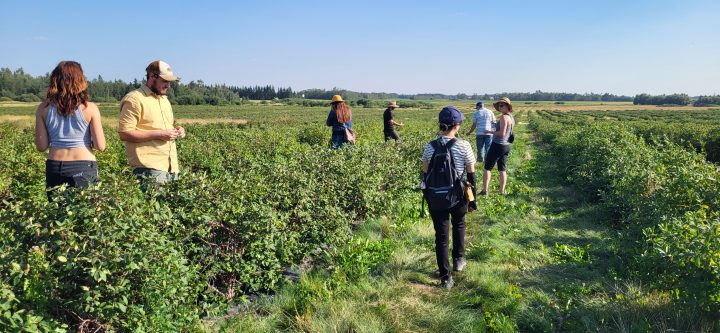 The next stop was the U-pick rows, planted on a downhill slope to capture as much water as possible before running into the dugout. These thirsty plants have shallow roots which need two to four litres of water per day. We got to roam through four rows with five different varieties – tundra, gem, beauty, beast and borealis. Each berry has its own juicy flavour!