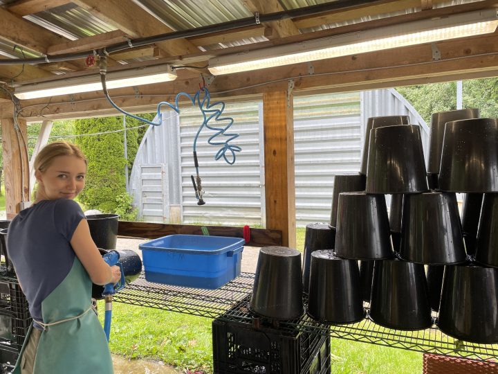 - Farm tasks of washing harvest bins, washing flower pails, clean up from market day
