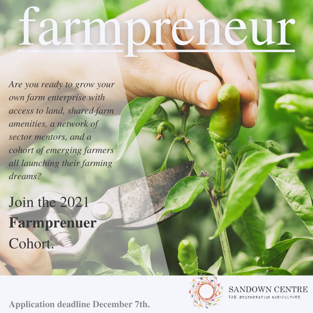 The Sandown Centre for Regenerative Agriculture is launching its FARMPRENEUR supported incubator plot program for the 2021 growing season. We know that being a successful farm is more than just growing food; being a farmpreneur also means building a healthy business mindset. Our Farmpreneur supported incubator plot comes with a land lease, shared production amenities, support getting to market, farming and business mentors, guest & site visits from experts working in the field, and opportunities to participate in agri-tourism events like food festivals and farm-to-fork dinners.