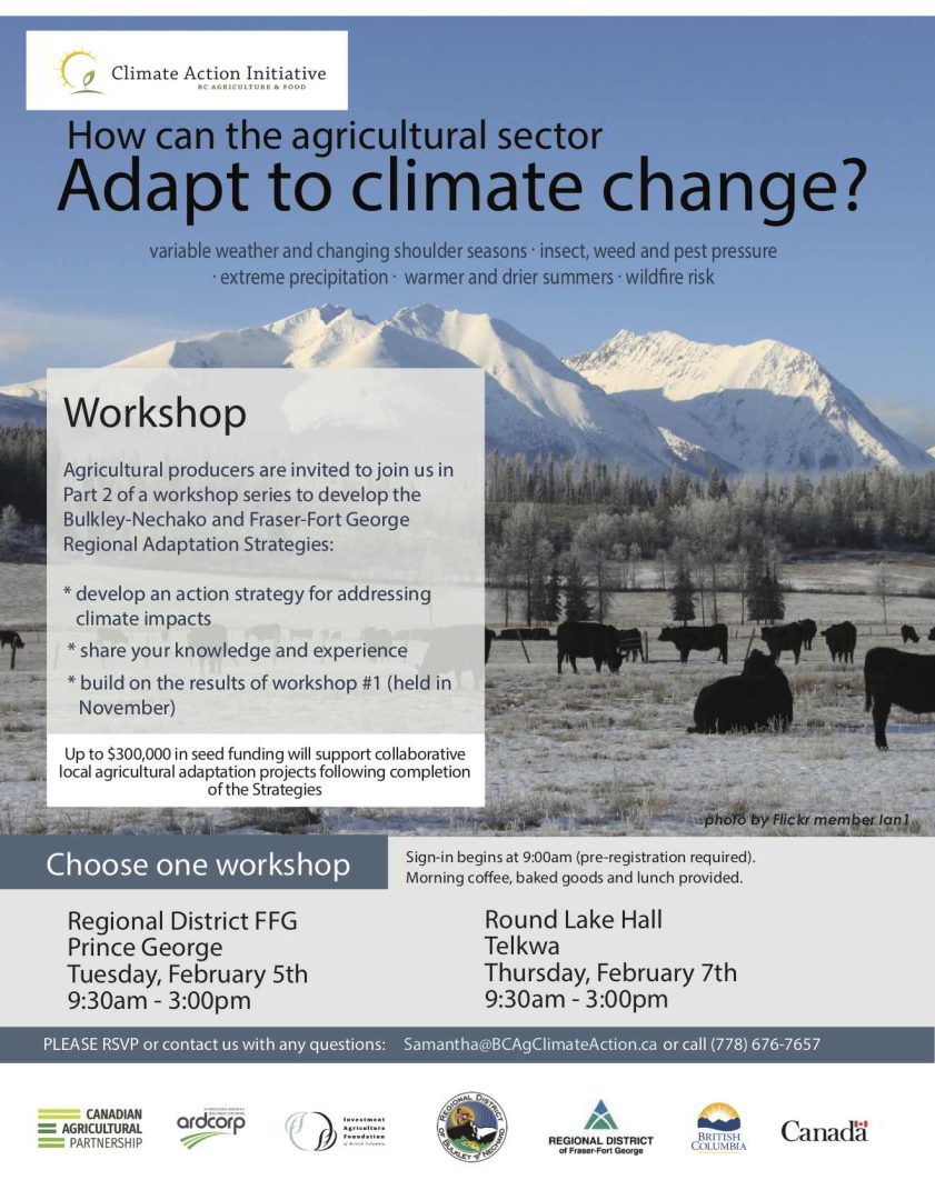 The BC Agriculture and Food Climate Action Initiative works with regional governments and local producers to develop tools and resources to enhance regional and agricultural resilience to climate change. The workshops are Part 2 of a Regional Adaptation Strategies planning process which will result in a clear set of local strategies and actions. At the workshops, you’ll be able to develop and action strategy for addressing climate impacts, share your knowledge and experience and build on the results of workshop #1 (held in November). We hope that many young farmers and new entrants will participate!
