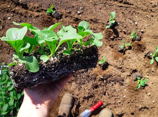 Air pruning means that when the roots reach the edge of the soil block, they dehydrate (as they would in the ground when their roots hit the top of the soil), and the plant gets a signal to stop extending roots in that direction and put its energy into developing roots elsewhere. Making soil blocks is more time consuming than filling a regular plastic cell tray with soil, but Emma says the farm team enjoys this time spent together in the greenhouse, and they save time transplanting because soil blocks don’t need to be popped out (and the seedlings never get stuck in their cells). Some farms build wooden trays for their soil blocks to further reduce plastic use as well.
