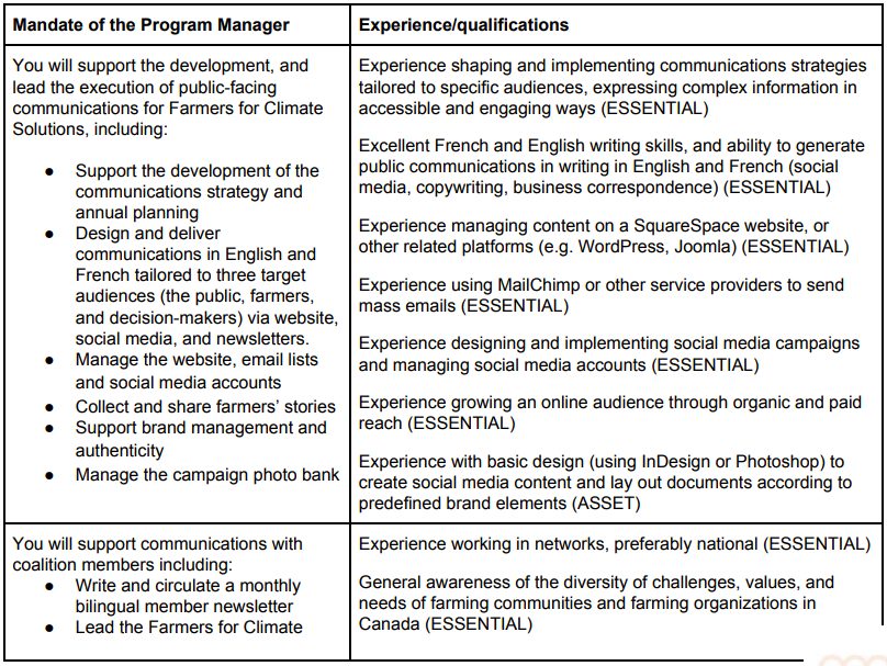 SeedChange is seeking a program manager to lead communications for Farmers for Climate Solutions, a pan-Canadian coalition of farmer-led organizations and supporters working to advance climate solutions in agriculture policy. This is an opportunity to work with incredible partners to advance policies to spread climate solutions on hundreds of thousands of acres of farmland across the country.