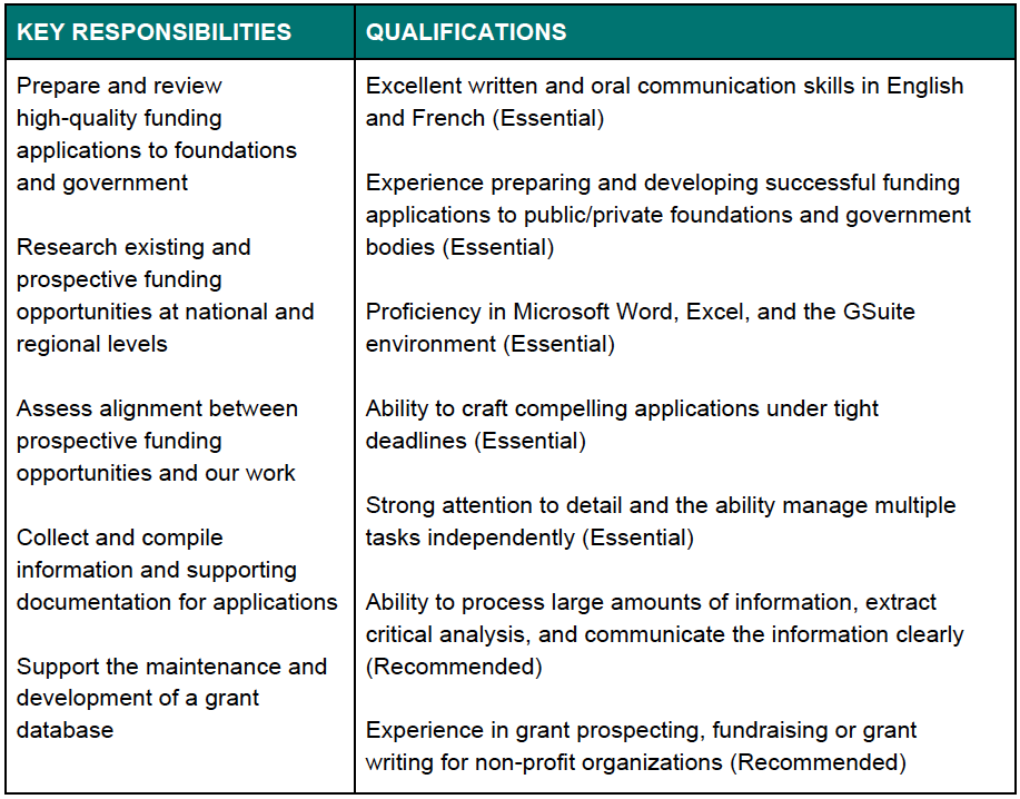 The grant writer will report to the Initiative’s director and collaborate with the research manager and regional coordinators to write and review grant applications. The candidate must have excellent written and oral communication skills in English and French. The key responsibilities and qualifications for this contract are provided in the table below. We understand candidates may not have all the experience/ qualifications listed. If you possess all of the essential requirements and the majority of the recommended qualifications, we encourage you to apply.