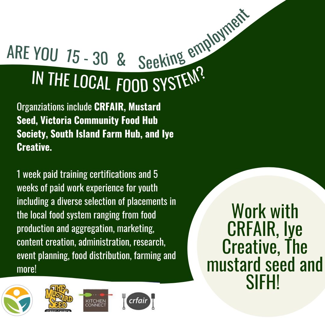 Positions will be available with the Food Security Distribution Centre (Mustard Seed), CRFAIR, Food Policy Task Force, South Island Farm Hub, Kitchen Connect, and The Iye Collective!