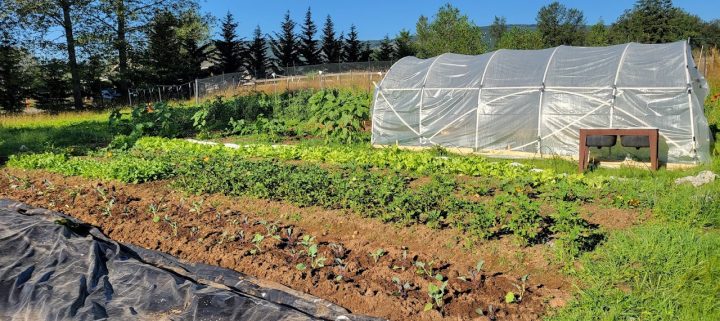 Having found a model in Lydia of the land-based and community-rooted future she wanted, Jaclyn started seeking resources to start her own farm. Jaclyn and her family moved to the Comox Valley in 2019, and as she got roots in the ground on her family’s small garden plot, she also got connected with Young Agrarians. She started attending YA events, participated in the Business Bootcamp, and linked up with Azja Jones Martin, the Vancouver Island Land Matcher at the time. Azja walked Jaclyn through the journey towards land access, providing her with a variety of land options throughout the Comox Valley. After considering a few different opportunities, Azja and Jaclyn settled on ¼ acre of land in Black Creek. Landholders Libby and Jim were two retired school teachers who were passionate about regenerative farming and reducing plastic pollution, and were excited to share their land with Jaclyn and her family. Their initial connection and shared vision blossomed into a mutually beneficial relationship full of respect and reciprocity.