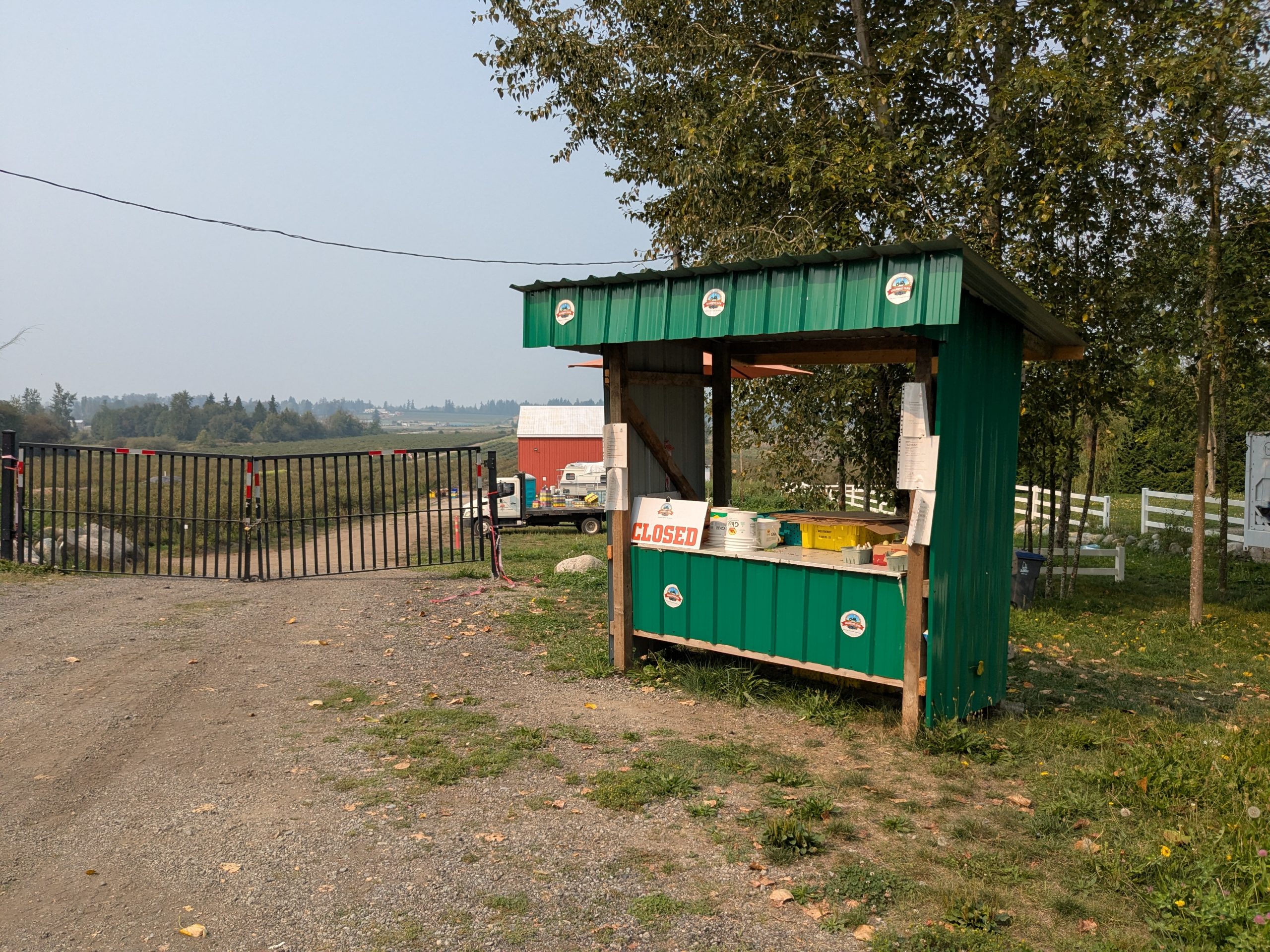 There is a seasonal farm stand already in place, which the incoming farmer could use for on-farm sales. There is also a barn with concrete pads, which could potentially be used as shared storage. Farm access roads have been established on the property, allowing for easy access and management of the farm plots, and the landholder is working on creating a designated parking space. Water for irrigation is available from a well on-site.
