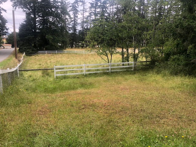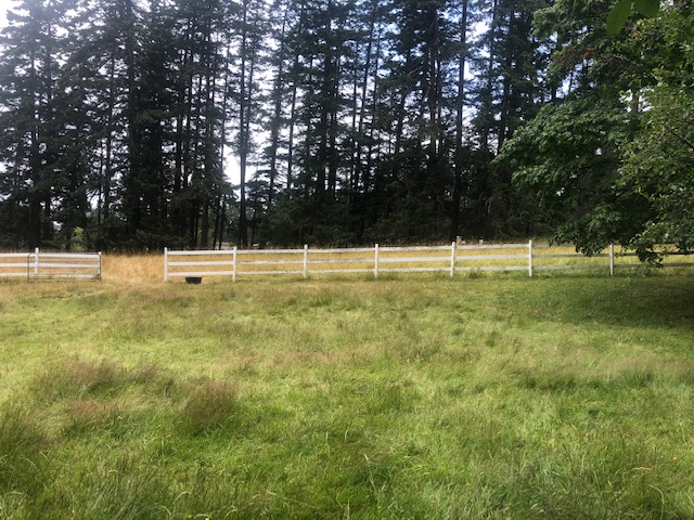 This 0.5 acre of available field space is currently in pasture, and is mostly flat with full exposure. A seasonal creek runs beside it, with sheep grazing in the adjacent field. The field has been used for grazing primarily in recent years, and has been hayed a few times in the last 16 years since the owners have had the property. Invasive species have been managed by cutting or hand weeding. There is fencing on three sides, but fencing would need to be enhanced to keep sheep and deer out of cultivated areas. A new water line would have to be brought to the leased area, water access is municipal.