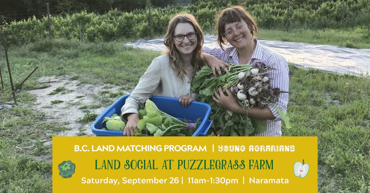 You’re invited to a socially-distanced Land Social at Puzzlegrass Farm, a small-scale vegetable farm on leased land in Naramata, B.C! If you’re curious about what land matching and sharing is all about, join us for the event.