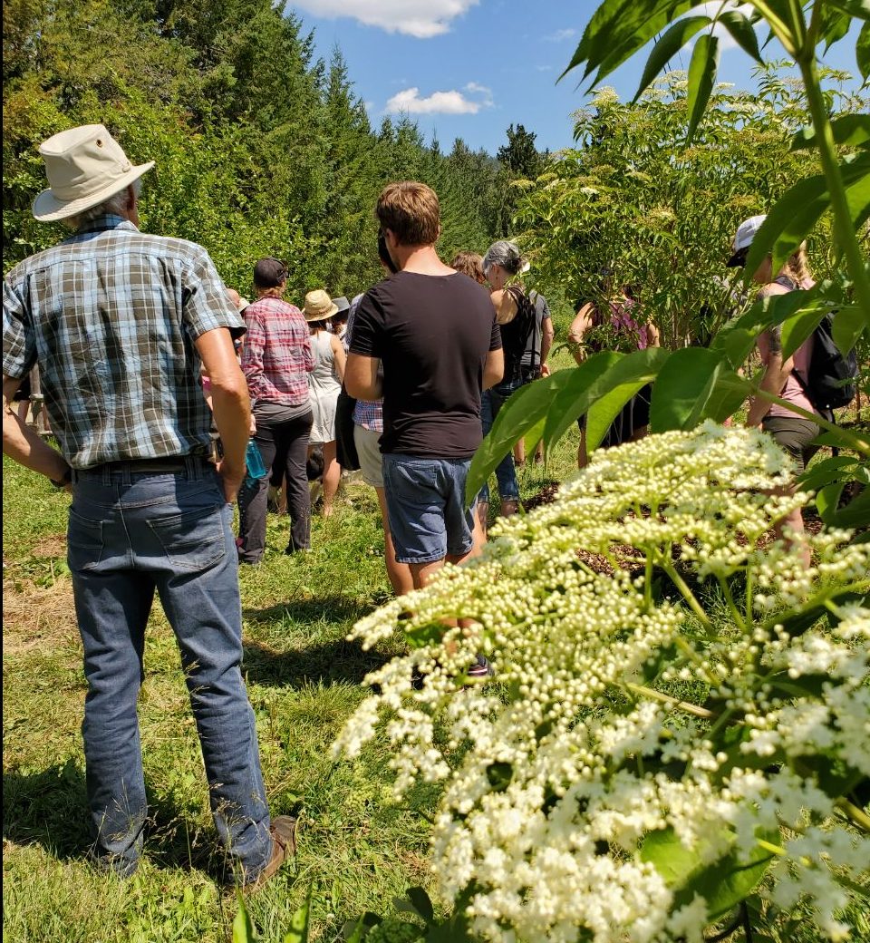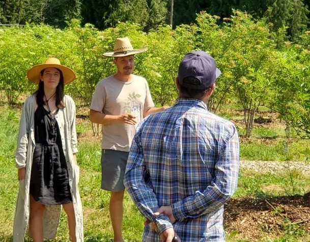 46 folks gathered in pockets of shade to kick off the farm tour with a bit of background on Jed and Louise’s passion for growing and producing medicinal elderberry syrups, how they started out leasing family land and how they have expanded over the last 3 years to add 2 more large acreages to their land base with the support of the B.C. Land Matching Program. They stressed the importance of having a secure agreement in place before investing in perennial crops on leased land.