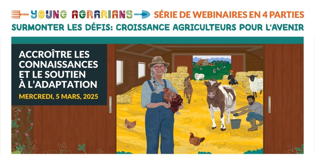 Environ ⅔ des nouveaux et nouvelles agriculteurs.trices au Canada ne sont pas issu.e.s d’une exploitation familiale (référence) et beaucoup ont un accès limité aux connaissances intergénérationnelles, ce qui rend plus difficile de faire face aux changements météorologiques imprévisibles, d’évaluer les conditions du sol, de prévoir les demandes et la volatilité du marché, et de s’adapter. Pour rester à flot dans un paysage agricole en pleine mutation, cette capacité est essentielle pour les nouveaux agriculteurs, dont bon nombre n’ont qu’un accès limité aux capitaux et à la terre. Dans ce dernier volet de la série de webinaires Faire tomber les barrières : Cultiver la relève agricole, nous explorerons la question de l’accès aux connaissances et aux soutiens à l’adaptation.