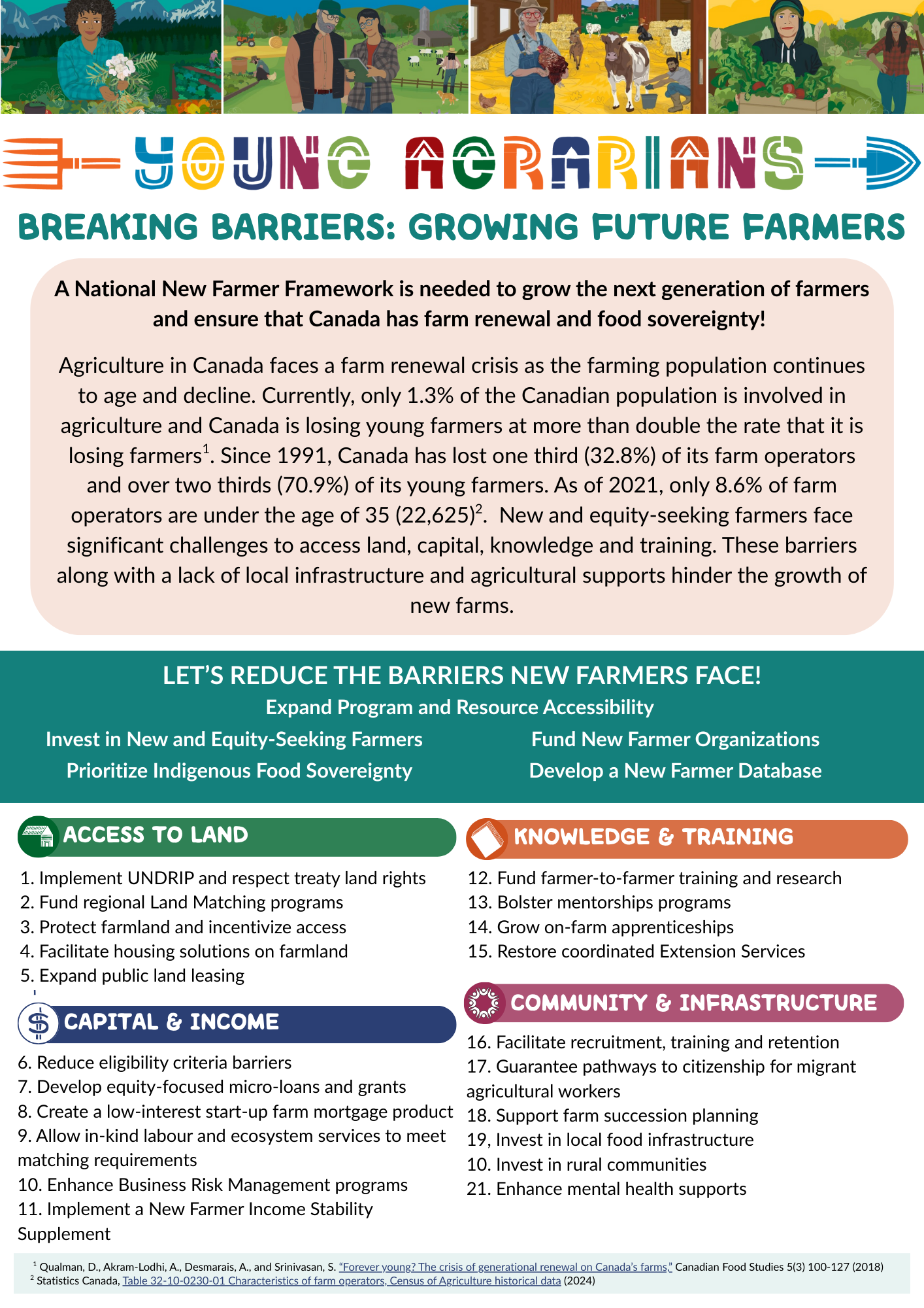 New and equity-seeking farmers face significant challenges in accessing land, capital, knowledge and training, hindering the growth of new farming enterprises. The current policy landscape fails to adequately address the needs of new farmers, which threatens the long-term sustainability of Canadian agriculture. A National New Farmer Framework is urgently needed to ensure farm renewal.