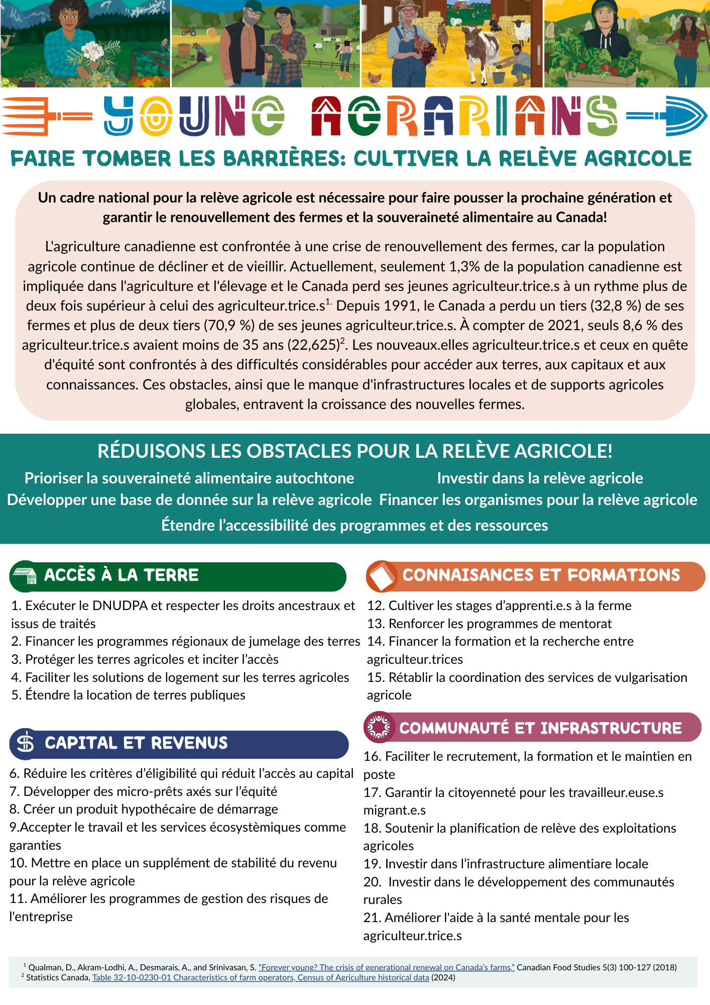Les nouveaux agriculteur.trice.s et les agriculteur.trice.s en quête d’équité sont confrontés à d’importants problèmes d’accès à la terre, au capital, aux connaissances et à la formation, ce qui entrave la croissance des nouvelles entreprises agricoles. Le paysage politique actuel ne répond pas de manière adéquate aux besoins des nouveaux agriculteurs, ce qui menace la viabilité à long terme de l’agriculture canadienne. Il est urgent de mettre en place un cadre national pour les nouveaux agriculteur.trice.s afin d’assurer le renouvellement des exploitations agricoles.