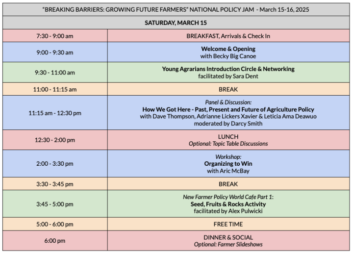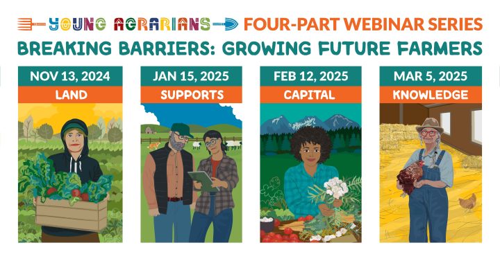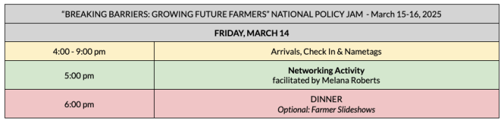 Help build the conversation up to the Policy Jam by participating in our 4-Part Webinar series Breaking Barriers: Growing Future Farmers. Topics will include speakers from across the country sharing stories, strategies, programs and opportunities around land access, working capital, wrap-around supports, and knowledge. Learn more and register here.