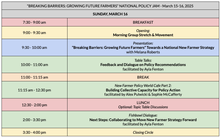 The Policy Jam will be a fun and creative space to build connections, share knowledge, and grow solidarity across the new farmer ecosystem. Discussions will be centred around barriers to entry for new, young and underrepresented farmers, share and gather feedback on draft New Farmer Policy Recommendations, and build capacity by growing the advocacy and policy skills of new farmers and farmer organizations.