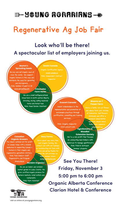 Are you nerdy about soil health? Are you buzzing about biodiversity? Are you excited about how farms can contribute positively to our planet? Young Agrarians and Organic Alberta are hosting a Regenerative Ag Job Fair to help you find a meaningful job in regenerative, ecological & organic agriculture.
