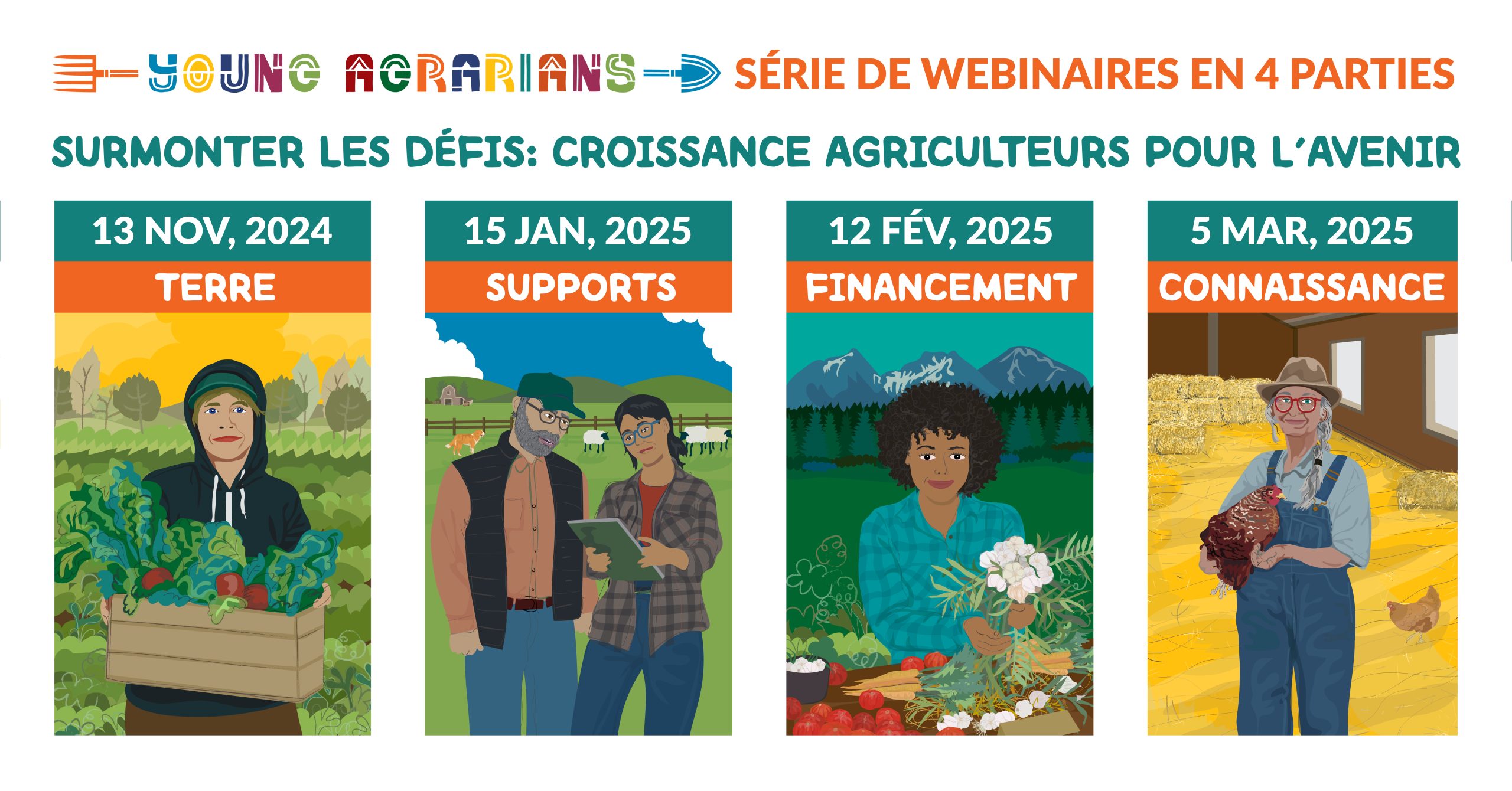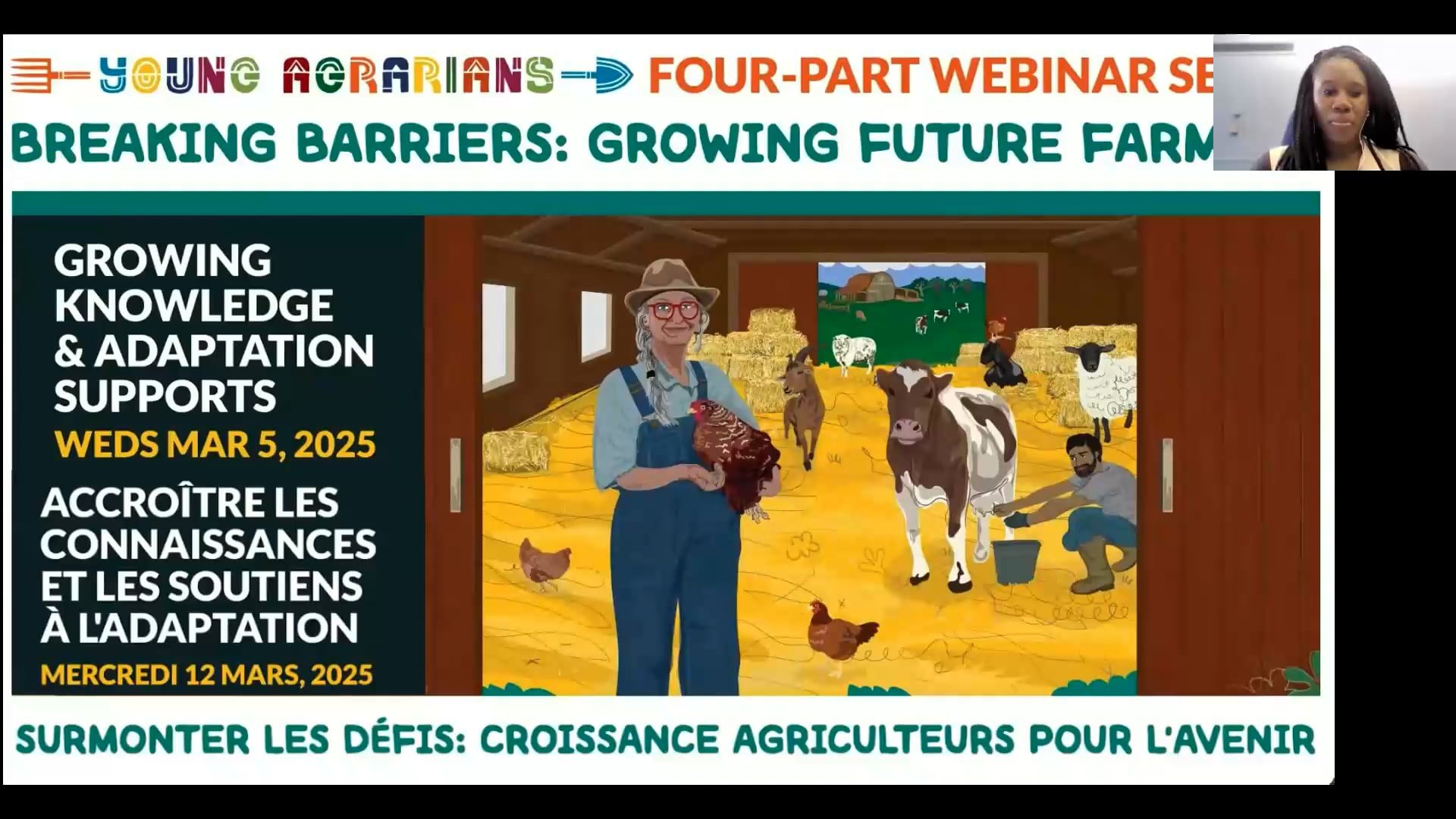 La série de webinaires en quatre parties intitulée « Surmonter les défis: croissance agriculteurs pour l’avenir » a présenté des histoires, des stratégies, des ressources, des programmes et des initiatives de financement visant à surmonter les obstacles auxquels se heurtent les nouveaux agriculteurs, à favoriser les liens et à informer de nouvelles approches afin de mieux soutenir les nouveaux et les jeunes agriculteurs dans tout le pays. Chaque séance a réuni des conférenciers dynamiques qui ont discuté de solutions novatrices pour renforcer la capacité des agriculteurs et des organisations agricoles à identifier des solutions et des actions qui combleront les lacunes de l’écosystème des nouveaux arrivants et conduiront à de futurs changements de politique au Canada.