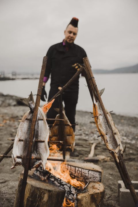 Jared “Qwustenuxun” Williams is a passionate traditional foods chef who works with elders and knowledge holders to keep traditional food practices alive. Jared spent much of his youth with his late grandmother, immersed in Salish culture. Raised in a world filled with smoke and fish Jared became familiar with many of the cooking methods and techniques used by his ancestors.