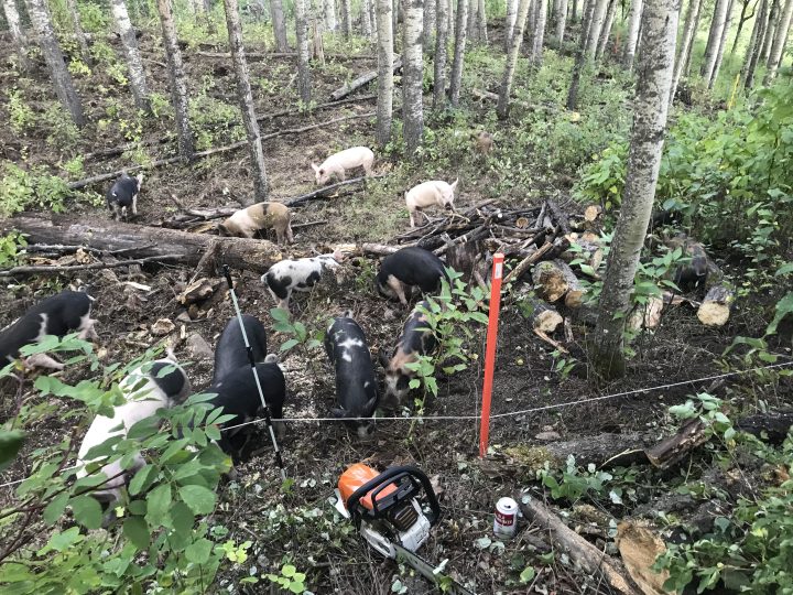 My forest-raised pigs take up about 6-8 acres per year, I keep them moving, they clean the forest floor and repair pastures or dig gardens or whatever I decide they need to work on, and they’re more than happy to help!