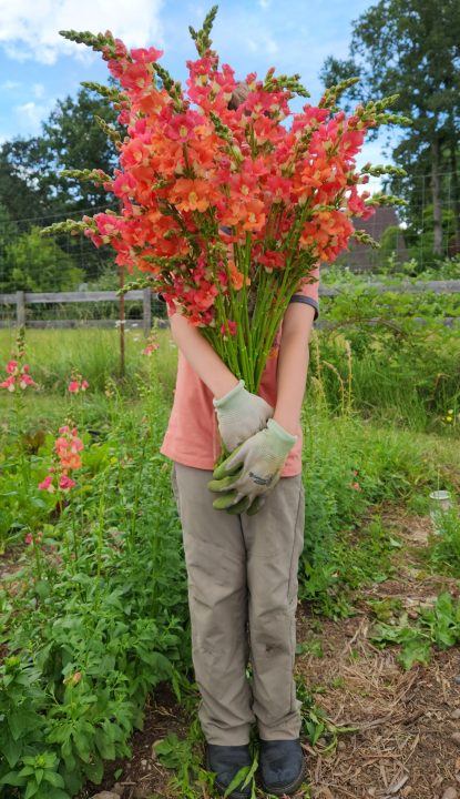 It’s Katy here, I have always had an interest in growing produce and dreamed of one day having the ability to buy our own farm. Our first home gave us the space to experiment with growing and the successes there are what drove the interest to grow on a larger scale. When we moved to Vancouver Island we learned about options to lease land which gave us the opportunity to be able to start our farming journey before being able to purchase a farm. Food sustainability and food security are causes that are near and dear to my heart as well as teaching youth about where our food comes from. The cut flower production came about through my son Gavin’s dream to have a flower farm. He is the one that drove that part of the business and has taught us a love and passion for flowers.