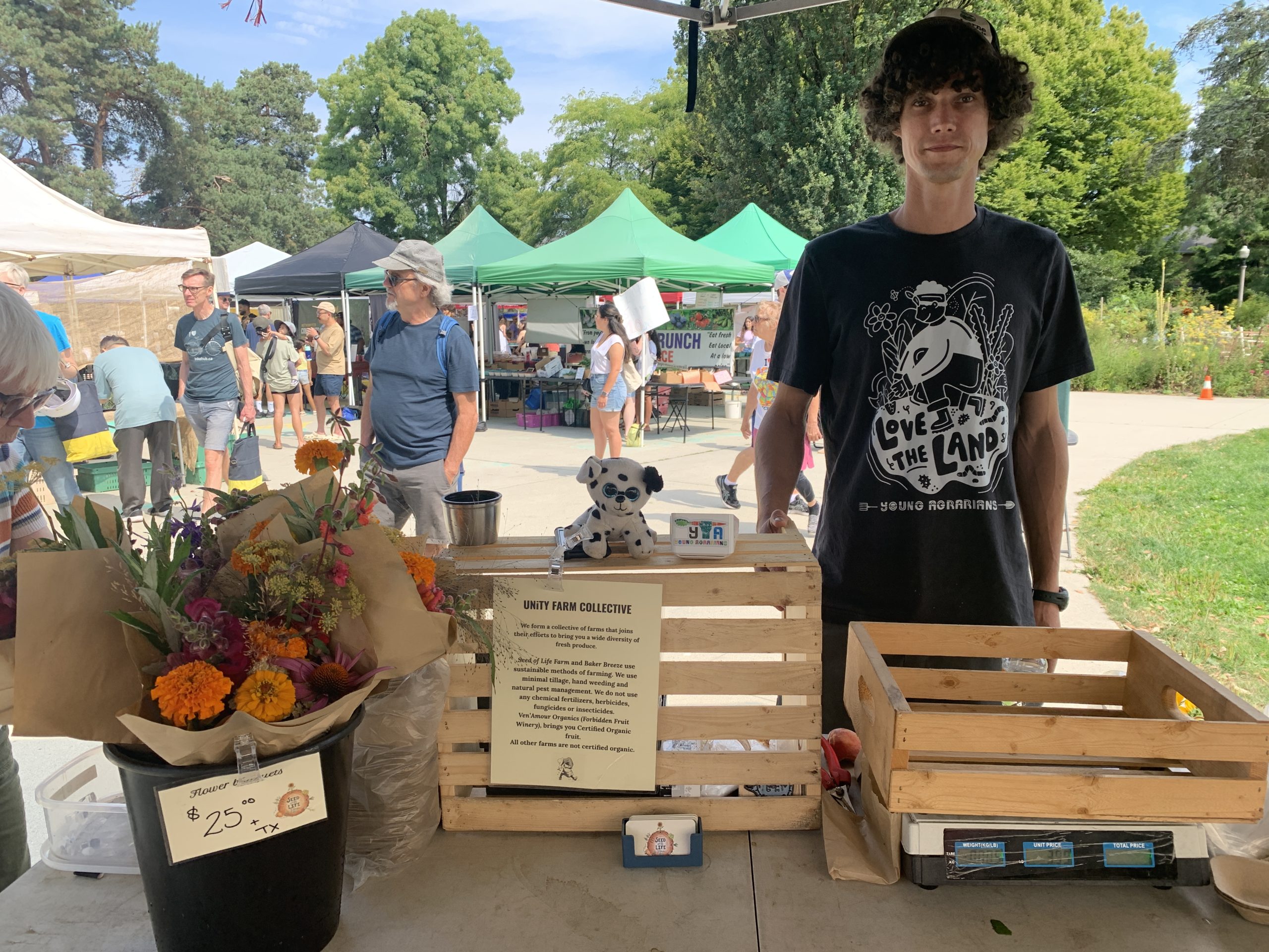 We seem to have a good amount of traffic at the market, customers appreciate that we put a big focus on selling crops that we consider the tastiest, they also love the diversity that our stall provides. We have a wide range of items for sale from veggies to fresh cut flowers grown on our farm with the addition of fresh fruit from the Okanagan. Our stall is inviting, we use lots of baskets and wooden boxes which gives it a warm feeling. Some customers do their weekly grocery shopping with us, a big step from previous years. It means to us that they appreciate the variety and value our produce.