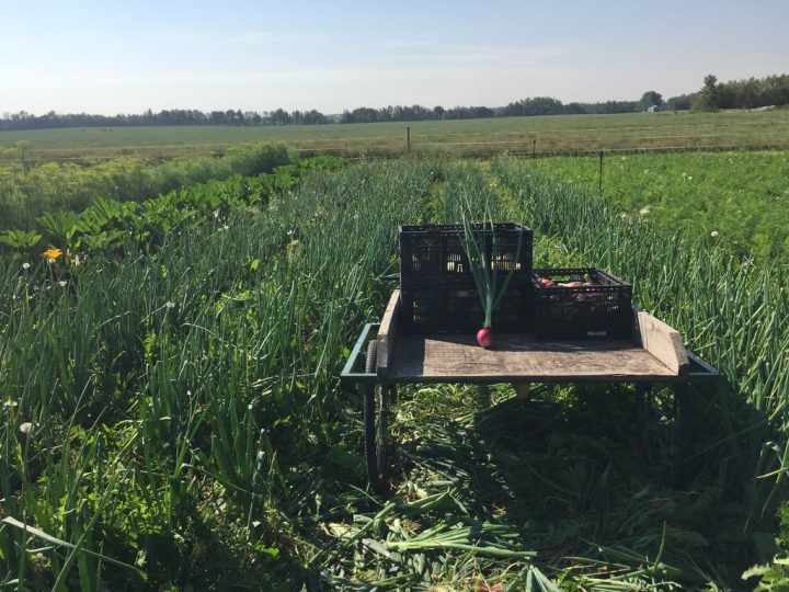 We have about 1/2 acre in mixed veggies – Carrots, onions, beets, garlic, peas beans, brassicas, and some flowers, and 2 acres of potatoes. I am planning to integrate some land into cover crops this season as we develop a fertility plan.